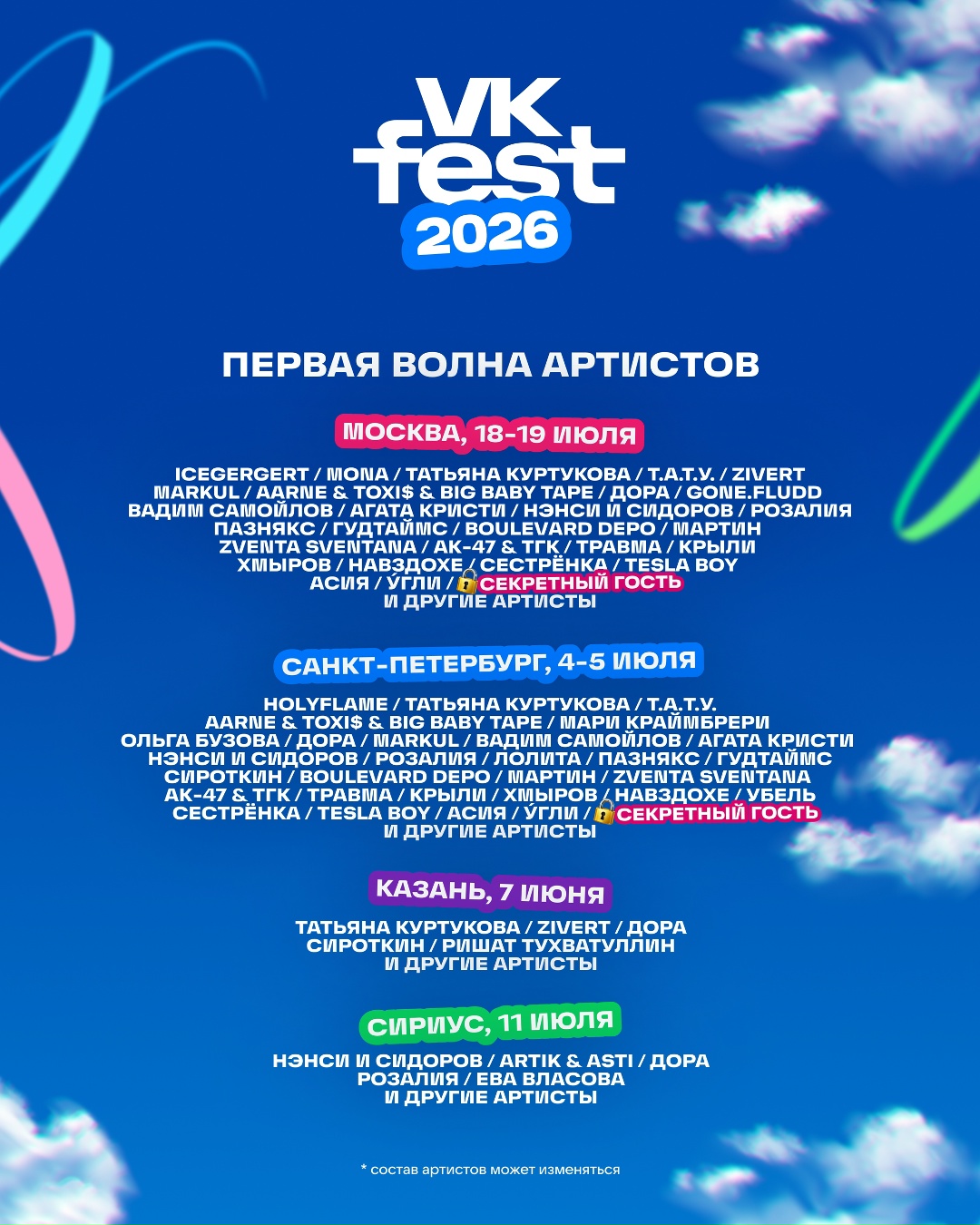 VK Fest озвучил и имена тех, кто выступит в Сириусе 11 июля: ARTIK & ASTI, Дора, NANSI & SIDOROV, Rozalia и Ева Власова. Кроме того, в Москве и Санкт-Петербурге в этом году появится секретный гость, которого знают все.
