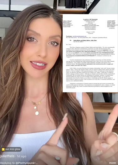 Как сообщает ЖАРА FM, адвокат супругов отправил девушке заявление, в котором предупредил, что пара будет с ней судиться, если та не прекратит распространять ложные факты о супругах и не удалит все ролики о них. По словам юриста, Джули Тайс «действует на свой страх и риск», так как у нее нет никаких доказательств того, о чем она говорит в видео.