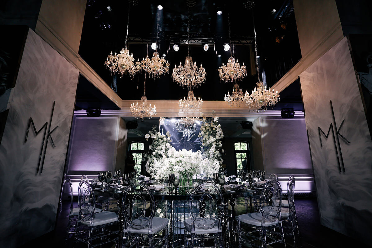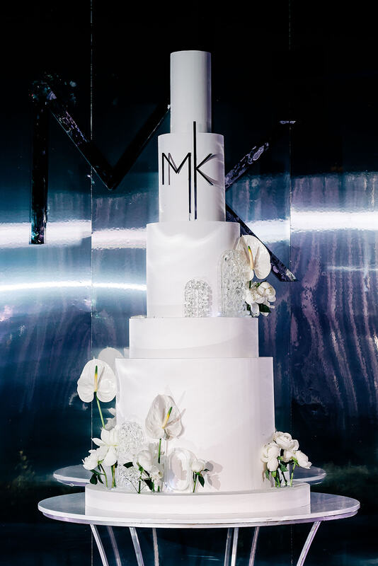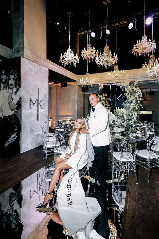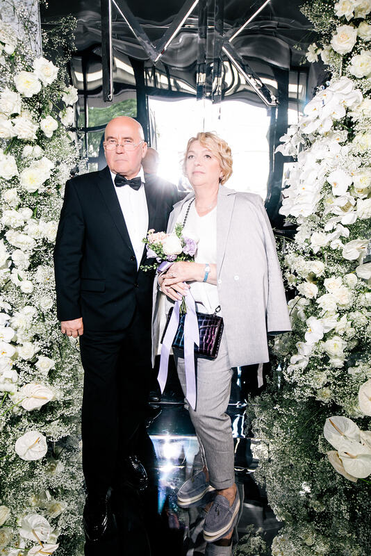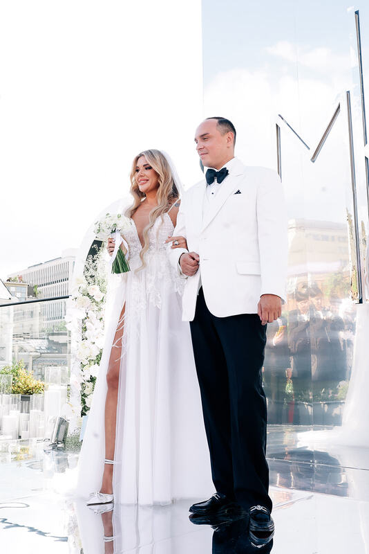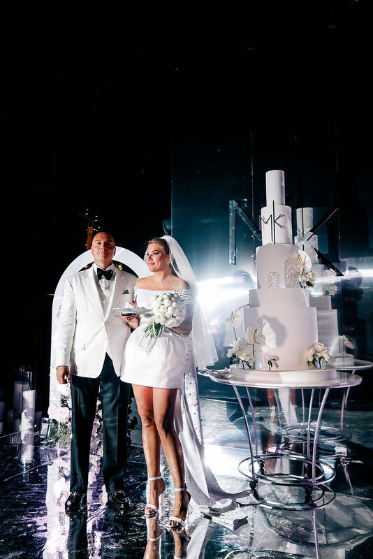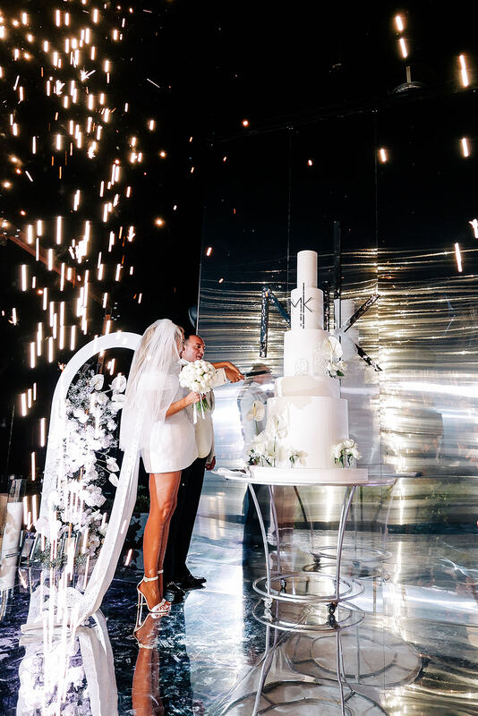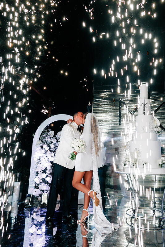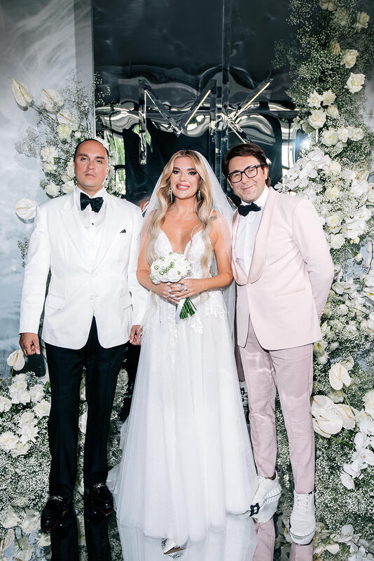 инициалами «Михаил-Катя», а на Михаиле был белоснежный смокинг в стиле Tom Ford. Первые образы обошлись паре в