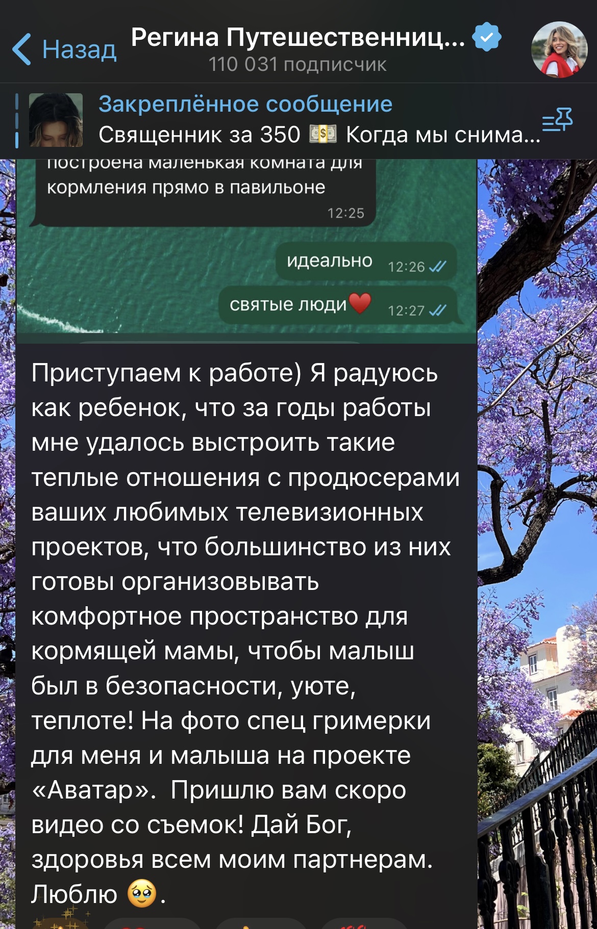 Регина опубликовала в своем канале скриншот переписки с представителями шоу «Аватар», в которой телеведущей сообщили, что на площадке для нее подготовили специальную комнату, где она может кормить ребенка.