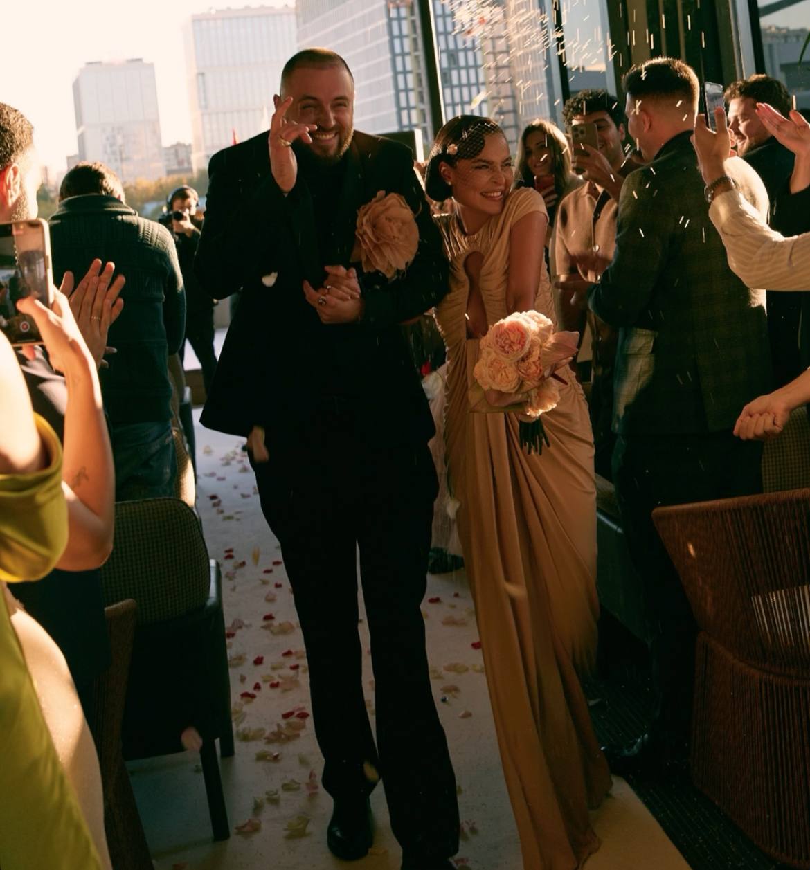 Севиль опубликовала фото с росписи, на котором не только видно кольцо на безымянном пальце артистки, но и свадебное платье и даже букет невесты. Супруги идут вдоль гостей и улыбаются им.