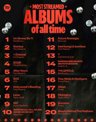 Самым прослушиваемым альбом назвали пластику Бэд Банни Un Verano Sin Ti. Кроме того, в топе Starboy и After Hours Уикенда, «Делюкс» Эда Ширана, «Соур» Оливии Родриго.