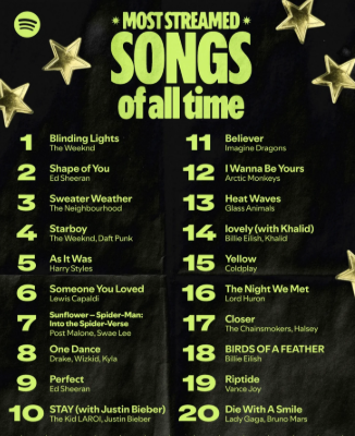 Больше всего прослушиваний за всю историю существования сервиса у композиции Уикенда Blinding Lights, следующая в списке — Shape of You Эда Ширана. Там же в топе композиция Гарри Стайлса As It Was.