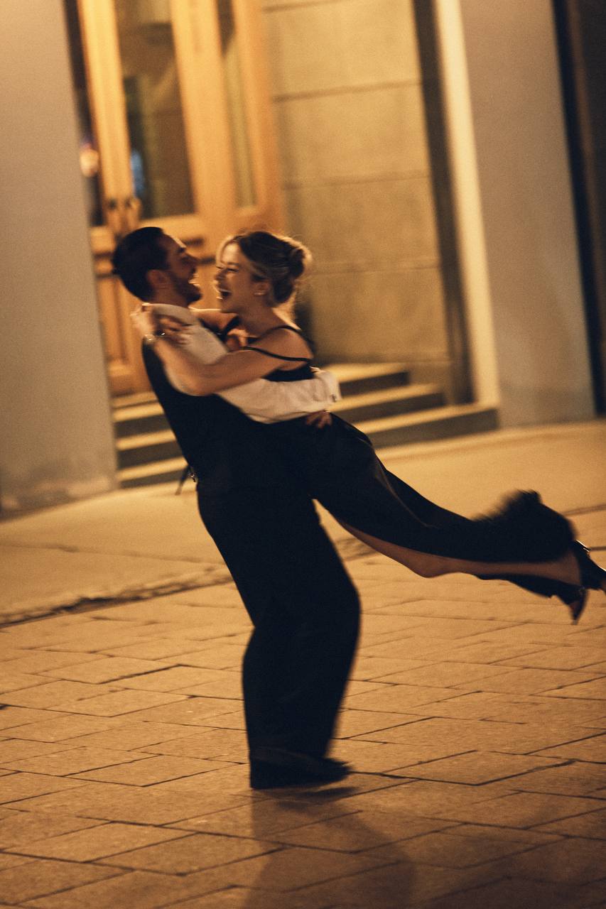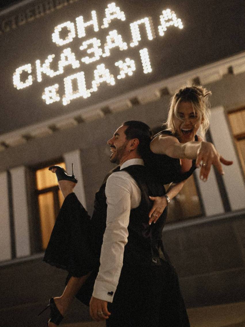Артист решил задать вопрос о женитьбе Кате оригинальным способом. Он встал на колено перед легендарным кинотеатром «Художественный». Когда Катя согласилась выйти за Тимура замуж, на здании загорелась фраза «Она сказала да».