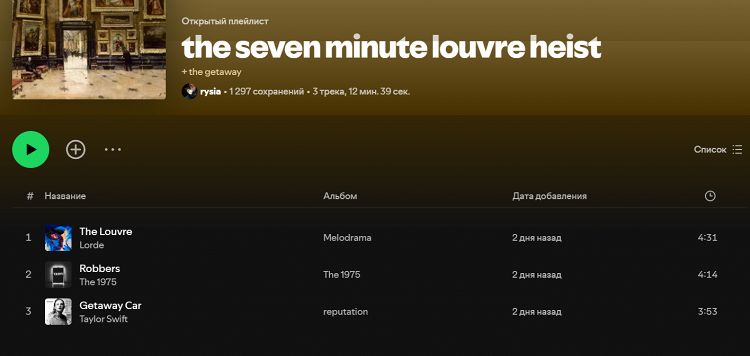 После нападения воров на Лувр в минувшие выходные, на музыкальной платформе Spotify появился плейлист «Семь минут на ограбление Лувра». Его создал один из пользователей площадки.